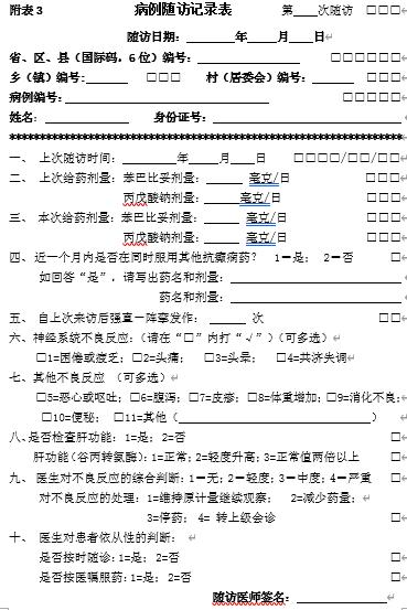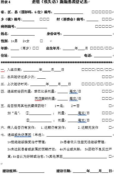 随访内容:记录患者用药剂量、发作次数、不良反应(如皮疹、肝功异常等),发放免费药物,开展用药依从性教育(确保家属掌握正确给药方法),填写标准化随访记录表附表3,如果患者退出治疗组或失访填写附表4,如果患者死亡填写附表5。