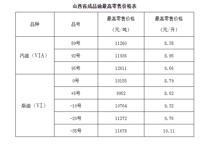 根据国家发展改革委门户网站“新闻动态--新闻发布”公布的成品油调价信息,自2022年5月30日24时起,山西省内汽、柴油价格(标准品)每吨分别提高400元和390元(具体价格见附表)。98号汽油价格,按照《国家发改委关于降低国内成品油价格的通知》(发改电[2015]10号)规定,由成品油生产经营企业根据市场情况自主制定具体价格。普通柴油(标准品)最高零售价格按照同阶段标准的车用柴油价格确定。其他相关价格政策按照《国家发展改革委关于进一步完善成品油价格形成机制有关问题的通知》(发改价格[2016]64号)规定执行。