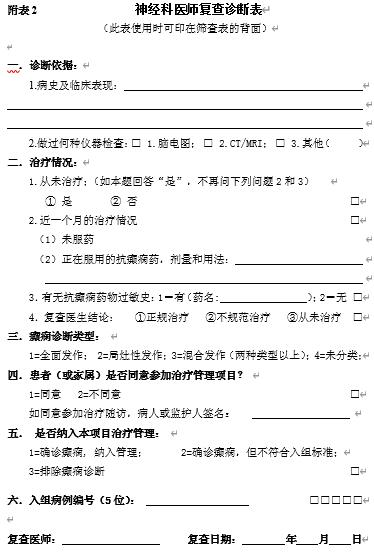 县级专家复核:由县人民医院神经科医师组成专家团队,对基层筛查的疑似病例进行复核确诊(依据《农村癫痫防治管理项目工作手册》诊断标准),填写附表2,明确是否为“活动性癫痫”并制定治疗方案。
