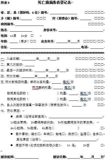 随访内容:记录患者用药剂量、发作次数、不良反应(如皮疹、肝功异常等),发放免费药物,开展用药依从性教育(确保家属掌握正确给药方法),填写标准化随访记录表附表3,如果患者退出治疗组或失访填写附表4,如果患者死亡填写附表5。