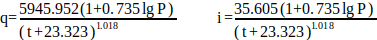 式中:q为设计暴雨强度(L/(s·hm2)),i为设计暴雨强度(单位: mm/min),P为设计重现期(a),t为降雨历时(min)。